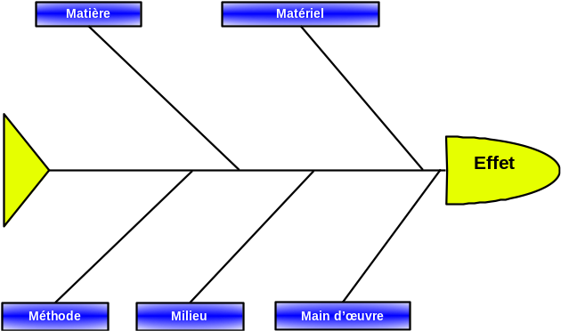Les causes potentielles sont regroupées par familles autour des « 5M» (Main-d’œuvre, Matériel, Matière, Méthode et Milieu)