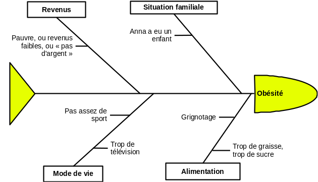 Ce diagramme se présente sous la forme d'arêtes de poisson dont la tête encadre l'effet dont on veut connaître les causes